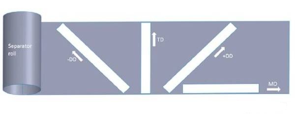 具體實(shí)驗(yàn)過程如下,首先將參與測試的隔膜材料根據(jù)ASTM針對薄膜材料的D882規(guī)范的要求,制成了具有規(guī)則形狀的長條形試樣,拉伸實(shí)驗(yàn)采用Instron 5944單向拉力機(jī)進(jìn)行測試,拉力加載速度為25mm/min。測試結(jié)果發(fā)現(xiàn),干法工藝制備的PE隔膜和三層復(fù)合隔膜在各個(gè)方向的抗拉強(qiáng)度上有很大的差距,例如在縱向MD上,抗拉強(qiáng)度>120MPa,在橫向TD和對角線方向上僅>20MPa。而濕法工藝制備的隔膜在各個(gè)方向上具有相似的抗拉強(qiáng)度(>140MPa),而無紡布工藝制備的隔膜的抗拉強(qiáng)度最差(<35MPa),無紡布隔膜在縱向和橫向具有相似的強(qiáng)度,但是對角線方向抗拉強(qiáng)度要明顯弱很多。