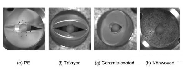 穿刺強(qiáng)度實(shí)驗(yàn)發(fā)現(xiàn),干法工藝制備的PE隔膜和三層復(fù)合隔膜會在沿著縱向的方向上出現(xiàn)一個(gè)較長的裂縫,而對于濕法工藝和無紡布工藝隔膜,失效多數(shù)只出現(xiàn)在局部,并且呈現(xiàn)圓形破口。