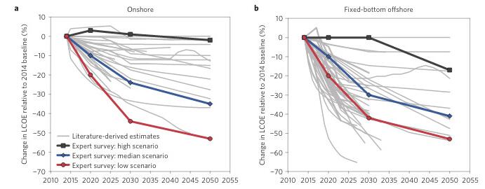 (LCOE指的是能源平準(zhǔn)化成本,上圖展示了與2014年相比,專家對LCOE預(yù)計(jì)降低成本的中值情形(0-50%),低值情形(0-10%)以及高值情形(0-90%),a圖是近岸風(fēng)能,b圖代表固定離岸風(fēng)能。)