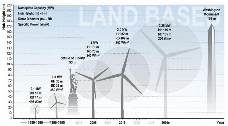 2015年,近岸風(fēng)力渦輪機(jī)的平均輪轂高度為82米,平均風(fēng)輪直徑為102米,平均功率輸出2兆瓦。到2030年,專家預(yù)測近岸風(fēng)力渦輪機(jī)的平均高度將達(dá)到115米,平均風(fēng)輪直徑135米,平均功率輸出3.25兆瓦。