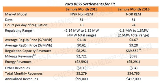 以2MW Vaca儲能系統(tǒng)為例,若完全參與調(diào)頻輔助服務(wù),2015年8月的總收益約$2000/MW,隨著CAISO日調(diào)頻采購價格升高,2016年3月儲能系統(tǒng)參與調(diào)頻的總收益更是達到了$7000/MW。 基于儲能項目2015-2016年實際調(diào)頻收益計算得到的年平均收益為$146700,NPV為$9191409(12年壽命,資金成本7%),對應(yīng)的盈虧平衡安裝成本為$291/kW。