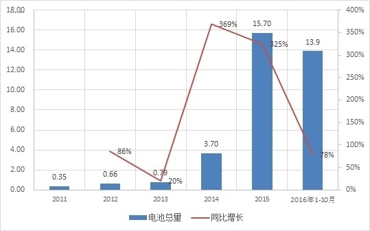 2011年-2016年動力電池出貨量變化 (單位:Gwh)