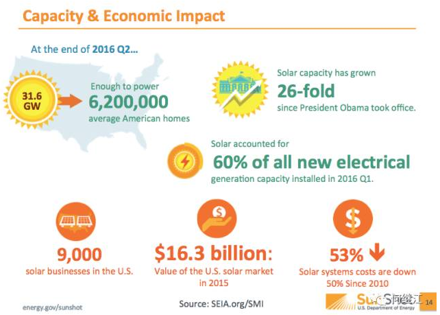 截止2016年6月底,美國(guó)的光伏裝機(jī)量已達(dá)31.6吉瓦,比奧巴馬總統(tǒng)就任時(shí)增長(zhǎng)了26倍,這些光伏所發(fā)電量足以滿足620萬(wàn)個(gè)家庭的用電。目前光伏發(fā)電量占到總供電量約1%。2016年第一季度,美國(guó)新裝發(fā)電機(jī)組約60%來(lái)自光伏。2015年美國(guó)的光伏市場(chǎng)規(guī)模高達(dá)163億美元。