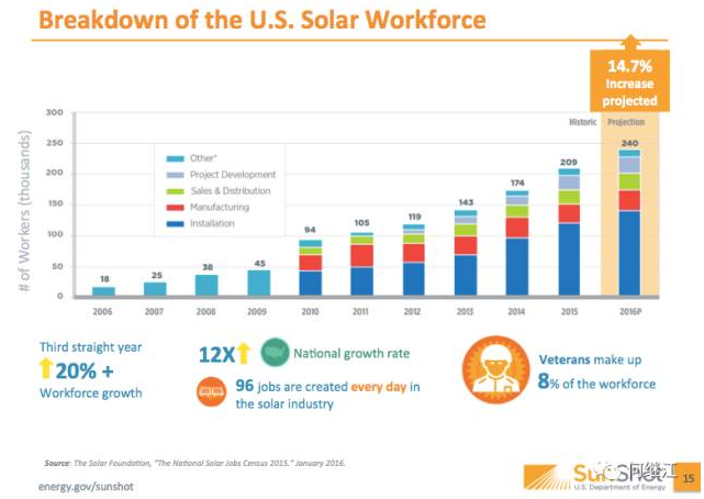 根據(jù)太陽(yáng)能基金會(huì)第六次年度“2015年國(guó)家太陽(yáng)能就業(yè)普查”報(bào)告,美國(guó)太陽(yáng)能產(chǎn)業(yè)正在以驚人的速度創(chuàng)造高技能,高薪工作,使工人人數(shù)增加比總體經(jīng)濟(jì)快12倍。