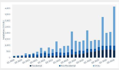 GTM Research副董事Cory Honeyman說:“受政府取消稅收抵免政策擔(dān)憂影響,2016年第三季度涌入大量公共事業(yè)規(guī)模項目儲備,這種趨勢將延續(xù)至2017上半年?!?
