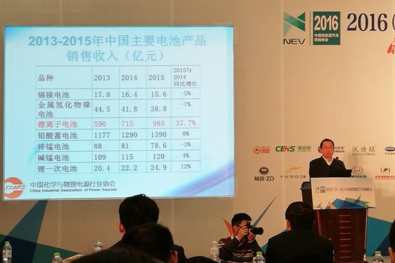 行業(yè)各類電池的一些整體的情況,從數(shù)量上來說鋰離子電池去年增長非???,大概54.9%,當(dāng)然包括了動力電池,這是電池行業(yè)主要產(chǎn)品他的一些銷售情況。發(fā)展最大領(lǐng)域可能還是鉛酸電池,傳統(tǒng)領(lǐng)域有1400億規(guī)模,鋰離子電池的話我們銷售收入去年增長37.7%,達(dá)到了985億元。整個鋰離子電池去年是發(fā)展機(jī)會,各家出現(xiàn)供不應(yīng)求的局面,主要在國家政策支部下,新能源汽車的快速發(fā)展。