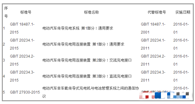 2015年12月28日,質(zhì)檢總局、國家標(biāo)準(zhǔn)委聯(lián)合國家能源局、工信部、科技部等部門,在京發(fā)布新修訂電動汽車充電接口及通信協(xié)議5項國家標(biāo)準(zhǔn),目前我國電動汽車直流接口等國家標(biāo)準(zhǔn)與美日歐并列為世界四大直流充電接口標(biāo)準(zhǔn)。