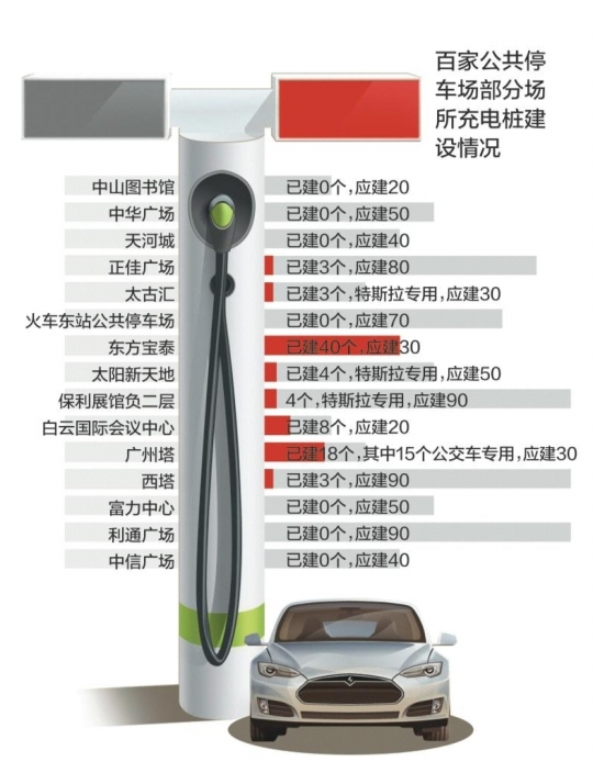 廣州市工信委今年8月組織實(shí)施“雙百行動(dòng)”,百家黨政機(jī)關(guān)、公共機(jī)構(gòu)及重點(diǎn)企業(yè),百個(gè)公共停車場加快建設(shè)充電設(shè)施,列出到2016年底和2018年底的建設(shè)目標(biāo)。中信、富力中心等重要的CBD寫字樓充電樁為零。南都記者隨機(jī)走訪百個(gè)公共停車場中的15個(gè),除了東方寶泰外,全部達(dá)不到建設(shè)目標(biāo),東站、中山圖書館等公共場所均未建設(shè)充電樁。