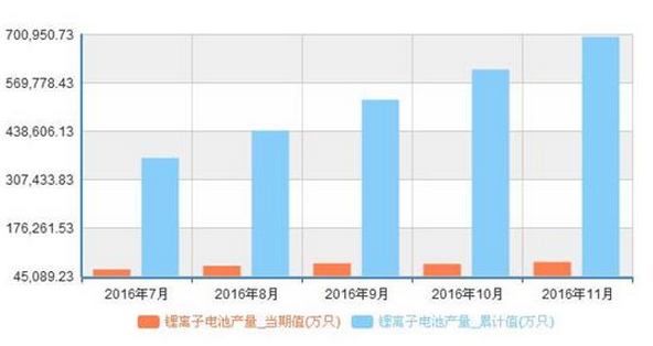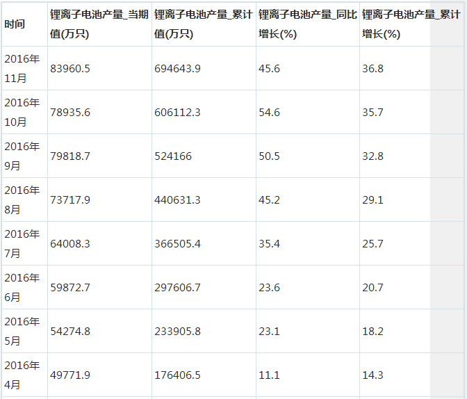 以下為2015年11月至2016年11月我國鋰離子電池產(chǎn)量統(tǒng)計(jì):
