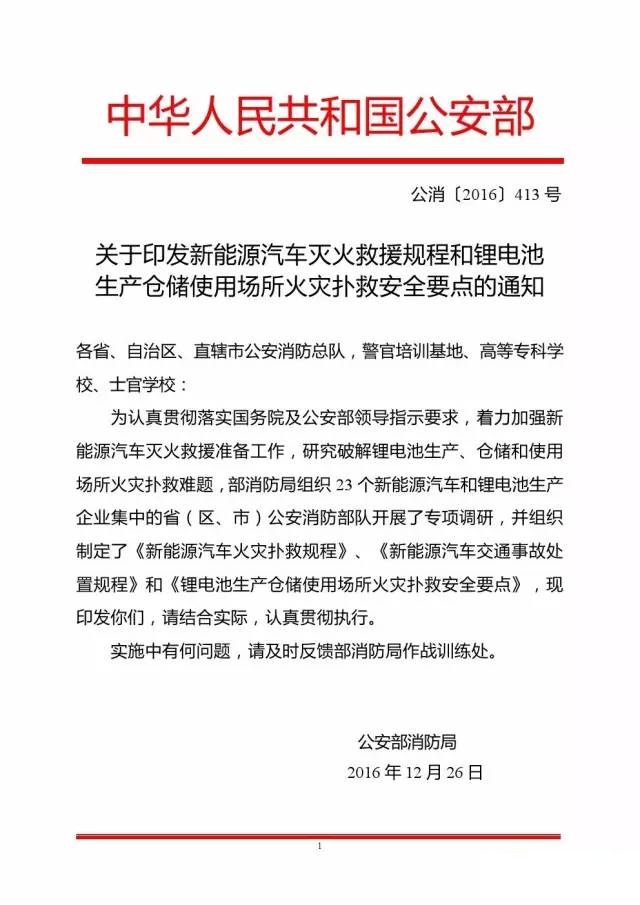 中國(guó)儲(chǔ)能網(wǎng)訊: 12月26日,公安部官網(wǎng)發(fā)布了《關(guān)于印發(fā)新能源汽車滅火救援規(guī)程和鋰電池生產(chǎn)倉(cāng)儲(chǔ)使用場(chǎng)所火災(zāi)撲救安全要點(diǎn)的通知》,《通知》內(nèi)容如下: