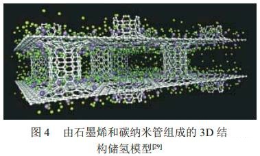 Dimitrakakis利用石墨烯和碳納米管設(shè)計了一個三維儲氫模型,如果這種材料摻入鋰離子,其在常壓下儲氫能力可以達(dá)到41g/L(圖 4)。因此,石墨烯這種新材料的出現(xiàn),為人們對儲氫/甲烷材料的設(shè)計提供了一種新的思路和材料。