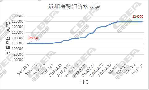 中國儲能網(wǎng)訊:據(jù)電池中國網(wǎng)統(tǒng)計,近期碳酸鋰價格穩(wěn)中有升,從2016年12月1日的104800元/噸上漲到2017年1月11日的124500元/噸,其中,興晟鋰業(yè)、四川國鋰分別將每噸報價提高3000元和1000元。國補出臺將進一步促進新能源汽車行業(yè)的發(fā)展,動力鋰電池作為新能源汽車的上游行業(yè)將從國家政策中受益,同時,作為動力鋰電池上游原材料的碳酸鋰也將迎來利好。然而,盡管碳酸鋰行業(yè)報價有提升,節(jié)前實際成交量并不大,仍需繼續(xù)關注行業(yè)內(nèi)產(chǎn)能釋放的影響。