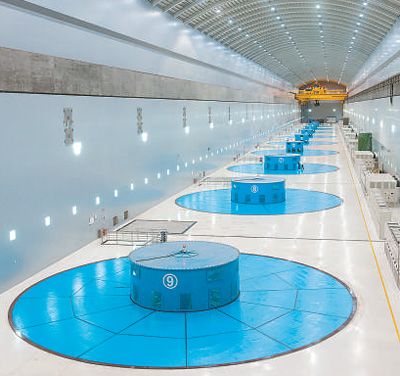 車輛駛進(jìn)交通洞,行駛五六分鐘后,來到左岸地下主廠房。洞室龐大,讓人驚駭,最大跨度為31.9米,高度75.1米。9臺(tái)水電機(jī)組一字排開,露在表面的部分十分巨大,下面主體之大讓人難以想象。地下廠房洞室群共有342條洞室,數(shù)量和尺寸均為世界之最。