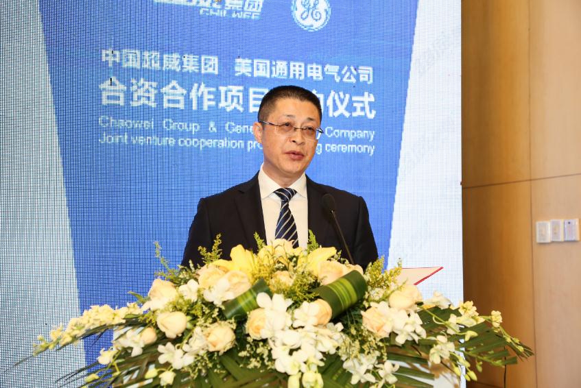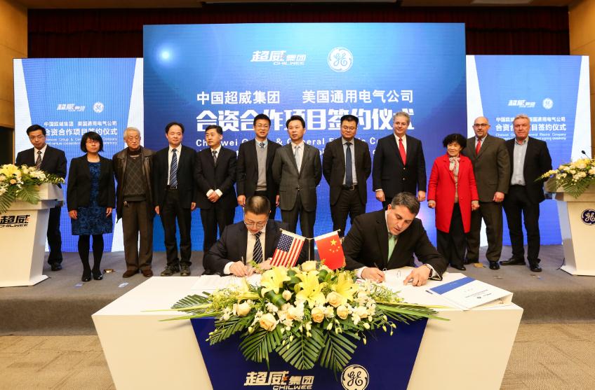超威集團董事長周明明(前排左)正在與GE公司代表簽約