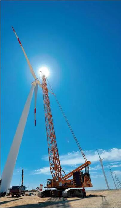 2015年6月5日,工人在新疆哈密煙墩第七風(fēng)電場(chǎng)進(jìn)行風(fēng)機(jī)吊裝 李華/攝