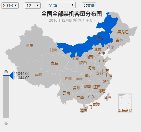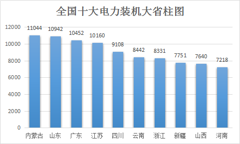 截至2016年底,全國電力裝機的十大省份分別是:內蒙古11044萬千瓦、山東10942萬千瓦、廣東10452萬千瓦、江蘇10160萬千瓦、四川9108萬千瓦、云南8442萬千瓦、浙江8331萬千瓦、新疆7751萬千瓦、山西7640萬千瓦、河南7218萬千瓦。