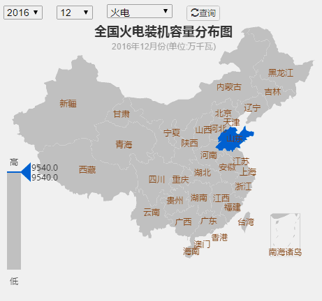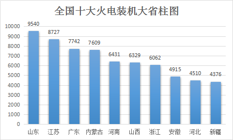 截至2016年底,全國火電裝機十大省份分別是:山東9540萬千瓦、江蘇8727萬千瓦、廣東7742萬千瓦、內蒙古7609萬千瓦、河南6431萬千瓦、山西6329萬千瓦、浙江6062萬千瓦、安徽4915萬千瓦、河北4510萬千瓦、新疆4376萬千瓦