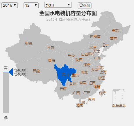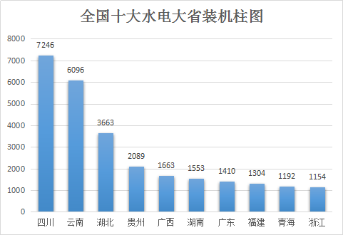 截至2016年底,全國水電裝機達到3.3億千瓦(含抽水蓄能2669萬千瓦),全國十大水電大省是:四川7246萬千瓦、云南6096萬千瓦、湖北3663萬千瓦、貴州2089萬千瓦、廣西1663萬千瓦、湖南1553萬千瓦、廣東1410萬千瓦、福建1304萬千瓦、青海1192萬千瓦、浙江1154萬千瓦。