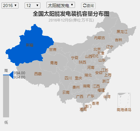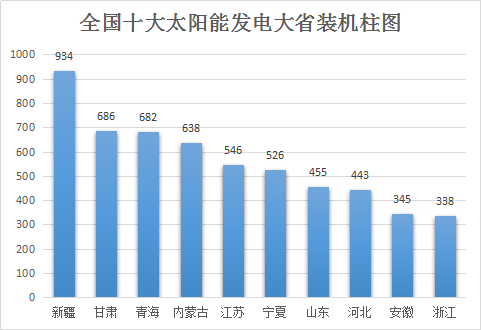 截至2016年底,全國并網(wǎng)太陽能發(fā)電7742萬千瓦,十大太陽能發(fā)電大省分別是,新疆934萬千瓦、甘肅686萬千瓦、青海682萬千瓦、內蒙古638萬千瓦、江蘇546萬千瓦、寧夏526萬千瓦、山東455萬千瓦、河北443萬千瓦、安徽345萬千瓦、浙江338萬千瓦。