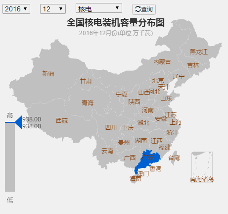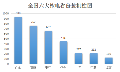 截至2016年底,全國核電裝機3364萬千瓦,全國六大核電省份:其中廣東938萬千瓦、福建762萬千瓦、浙江657萬千瓦、遼寧448萬千瓦、廣西217萬千瓦、江蘇212萬千瓦、海南130萬千瓦。