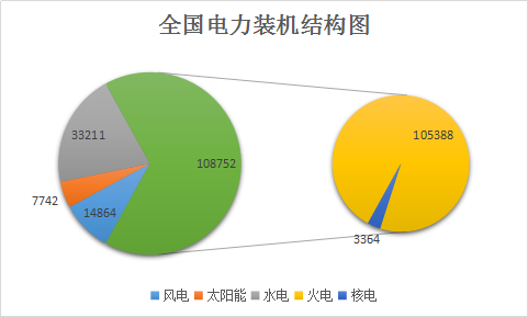 截至2016年底,全國火電裝機105388萬千瓦、水電33211萬千瓦、風電14864萬千瓦、太陽能發(fā)電7742萬千瓦、核電3364萬千瓦。