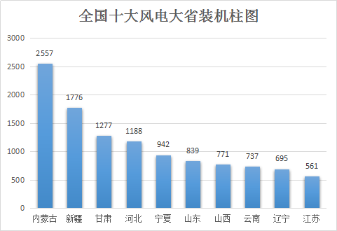 截至2016年底,全國并網(wǎng)風電1.5億千瓦,全國十大風電大省分別是:內蒙古2557萬千瓦、新疆1776萬千瓦、甘肅1277萬千瓦、河北1188萬千瓦、寧夏942萬千瓦、山東839萬千瓦、山西771萬千瓦、云南737萬千瓦、遼寧695萬千瓦、江蘇561萬千瓦。