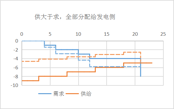 這是2016年規(guī)則下的供大于求情況。這種情況下申報價差為負,ks?>0,kd?>0, ks?+kd?=1。2016年廣東省的集中競價交易中,3-5月份的kd?=0.25,ks?=0.75,6月份后,調(diào)整為kd?=ks?=0.5。