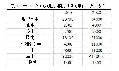 結(jié)合“十五”以來(lái)的電力經(jīng)濟(jì)關(guān)系量化特征和2014年以來(lái)的新趨勢(shì),“十三五”期間4.8%的電力需求增速預(yù)期顯然過(guò)于樂(lè)觀,7萬(wàn)億千瓦時(shí)可能是2020年全社會(huì)用電量的上限。“十三五”期間,全國(guó)常規(guī)水電新增投產(chǎn)約4000 萬(wàn)千瓦,開(kāi)工6000 萬(wàn)千瓦以上,到2020 年,常規(guī)水電裝機(jī)達(dá)到3.4 億千瓦,抽水蓄能電站裝機(jī)新增約1700 萬(wàn)千瓦,達(dá)到4000 萬(wàn)千瓦左右;全國(guó)核電投產(chǎn)約3000 萬(wàn)千瓦,開(kāi)工3000 萬(wàn)千瓦以上,2020 年裝機(jī)達(dá)到5800 萬(wàn)千瓦。2020 年,風(fēng)電裝機(jī)達(dá)到2.1 億千瓦以上;太陽(yáng)能發(fā)電裝機(jī)達(dá)到1.1 億千瓦以上。“十三五”期間,氣電新增投產(chǎn)5000 萬(wàn)千瓦,2020 年達(dá)到1.1 億千瓦以上?!笆濉逼陂g,取消和推遲煤電建設(shè)項(xiàng)目1.5 億千瓦以上;煤電裝機(jī)規(guī)模力爭(zhēng)控制在11 億千瓦以?xún)?nèi)。