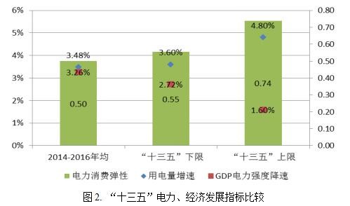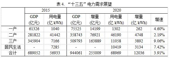 根據(jù)“十三五”規(guī)劃綱要的發(fā)展目標(biāo),“十三五”期間GDP年均增速要保持在6.5%以上,預(yù)計(jì)到2020年,我國(guó)GDP總量將達(dá)到94.4萬(wàn)億元。結(jié)合電力發(fā)展規(guī)劃目標(biāo),預(yù)計(jì)“十三五”我國(guó)電力消費(fèi)彈性系數(shù)約為0.74。由表2中的數(shù)據(jù)可以看出,以電力消費(fèi)彈性這一指標(biāo)來(lái)看,從“十五”到“十三五”,該指標(biāo)一直呈下降趨勢(shì)。然而,“十三五”期間電力彈性能否維持0.74的水平,這仍然是一個(gè)值得深思的問(wèn)題;也就是說(shuō)“十三五”期間,年均4.8%甚至更高的用電量增速是值得深究的。