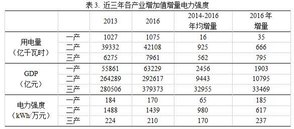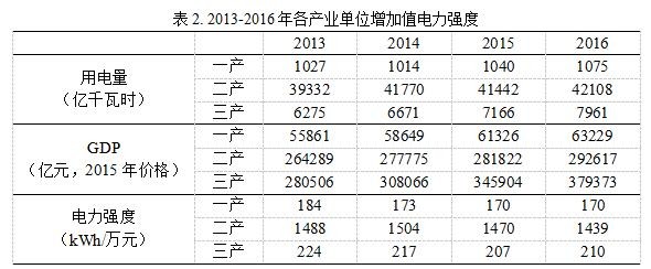 進(jìn)一步,對(duì)三次產(chǎn)業(yè)近三年的增加值增量與用電量增量的關(guān)系進(jìn)行分析。結(jié)果表明,平均來(lái)看,各產(chǎn)業(yè)近三年增加值增量部分的電力強(qiáng)度均比對(duì)應(yīng)年份的總體水平低,“二產(chǎn)”尤為明顯,這也與各產(chǎn)業(yè)電力強(qiáng)度持續(xù)下降的趨勢(shì)吻合。