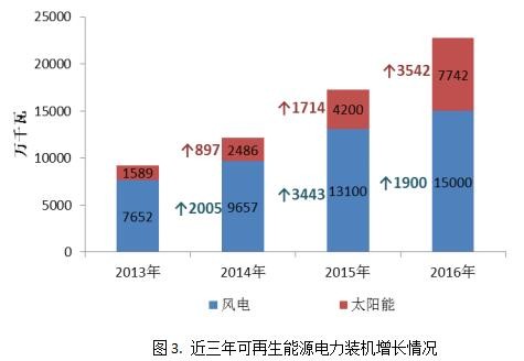 從近三年可再生能源電力裝機(jī)增長(zhǎng)情況來(lái)看,風(fēng)電和太陽(yáng)能裝機(jī)規(guī)模均快速增長(zhǎng),可再生裝機(jī)規(guī)模年均增長(zhǎng)約4500萬(wàn)千瓦。具體來(lái)看,截至2016年,我國(guó)風(fēng)電裝機(jī)規(guī)模1.5億千瓦,近三年年均增長(zhǎng)約2500萬(wàn)千瓦;太陽(yáng)能裝機(jī)規(guī)模7742萬(wàn)千瓦,近三年年均增長(zhǎng)約2000萬(wàn)千瓦。而根據(jù)“十三五”電力規(guī)劃的發(fā)展目標(biāo),2020年風(fēng)電裝機(jī)在2015年1.3億千瓦的基礎(chǔ)上新增約8000萬(wàn)千瓦,年均投產(chǎn)僅1600萬(wàn)千瓦,太陽(yáng)能裝機(jī)規(guī)模目標(biāo)為1.1億千瓦,新增6800萬(wàn)千瓦,年均投產(chǎn)僅1360萬(wàn)千瓦。與近幾年的發(fā)展趨勢(shì)相比,按照規(guī)劃目標(biāo),可再生電力發(fā)展速度卻將明顯放緩。