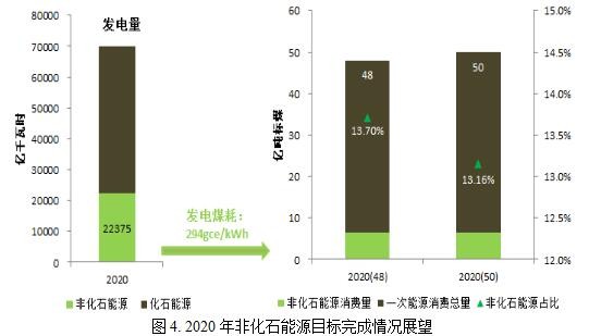 從非化石能源目標(biāo)來(lái)看,根據(jù)“十三五”電力規(guī)劃,預(yù)計(jì)2020年我國(guó)非化石能源發(fā)電量為2.24萬(wàn)億千瓦時(shí)。按照310gce/kWh的供電煤耗目標(biāo)(對(duì)應(yīng)的發(fā)電煤耗水平約294gce/kWh)核算,非化石電力生產(chǎn)對(duì)應(yīng)的一次能源供應(yīng)量為約6.6億噸標(biāo)煤。按照50億噸標(biāo)準(zhǔn)煤的一次能源消費(fèi)預(yù)期目標(biāo)來(lái)計(jì)算,電力非化石一次能源占比僅為13.2%,15%的非化石能源占比目標(biāo)料難完成。我們考慮2020年50億噸標(biāo)煤的一次能源消費(fèi)量目標(biāo)可能過(guò)于樂(lè)觀;但即便是按照較為合理的48億噸標(biāo)準(zhǔn)煤來(lái)計(jì)算,電力非化石能源在一次能源中的占比也僅為13.7%,與15%的目標(biāo)仍有較大差距。