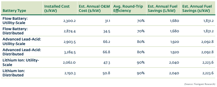 報告中特別指出,除了電網(wǎng)基礎(chǔ)設(shè)施依靠儲能系統(tǒng)可以提供更多的服務外,偏遠地區(qū)的微電網(wǎng)還因儲能系統(tǒng)的接入而極大地降低了對柴油發(fā)電的依賴性。在年度節(jié)油方面,公共事業(yè)規(guī)模儲能和分布式鋰離子儲能都比燃油具有更明顯的優(yōu)勢,安裝成本分別是2062美元/kW和2150.3美元/kW,節(jié)油成本均達到2223.6,美元/kW。