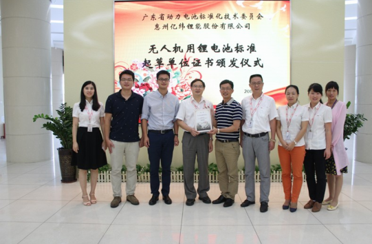公司牽頭的地方標(biāo)準(zhǔn)《DB44T 1771-2015分箱式充電機(jī)通用技術(shù)條件》通過評(píng)審,被授予突出貢獻(xiàn)獎(jiǎng),于2016年4月由廣東省質(zhì)量技術(shù)監(jiān)督局批準(zhǔn)發(fā)布實(shí)施;《電子煙用鋰離子電池 安全要求》,通過立項(xiàng),征求意見階段;參與的《DB44/T 1885-2016無(wú)人機(jī)用鋰電池電池組 技術(shù)要求》于2016年9月通過廣東省產(chǎn)品質(zhì)量監(jiān)督批準(zhǔn)局發(fā)布。同時(shí)還參與了《電動(dòng)汽車用鋰電池管理系統(tǒng)》和《純電動(dòng)及混合動(dòng)力電動(dòng)汽車電池系統(tǒng)安全要求》、《平衡車用鋰離子電池》、《電動(dòng)汽車用電池系統(tǒng)環(huán)境適應(yīng)性試驗(yàn)方法》、《營(yíng)運(yùn)電動(dòng)車輛綜合性能檢測(cè)要求及方法》、《電動(dòng)汽車充電站運(yùn)行和服務(wù)規(guī)范》等近10項(xiàng)地方標(biāo)準(zhǔn)制修定,標(biāo)準(zhǔn)分布在電池安全、電池管理系統(tǒng)、充電站等。2016年8月,廣東省產(chǎn)品質(zhì)量監(jiān)督檢驗(yàn)研究院、廣東省動(dòng)力電池標(biāo)準(zhǔn)化技術(shù)委員會(huì)授牌億緯鋰能為“無(wú)人機(jī)用鋰電池”地方標(biāo)準(zhǔn)起草單位。