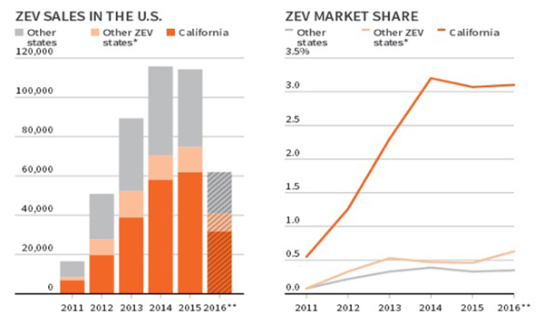 如果算上已經(jīng)與采用加州電動汽車“積分制”標(biāo)準(zhǔn)的其他9個州,加州及采用加州標(biāo)準(zhǔn)的其他9州占全美汽車市場的40%。加州也是美國最大的電動汽車市場,2016年加州電動汽車保有量約占全美55%,可以說形成了事實(shí)上的加州系。