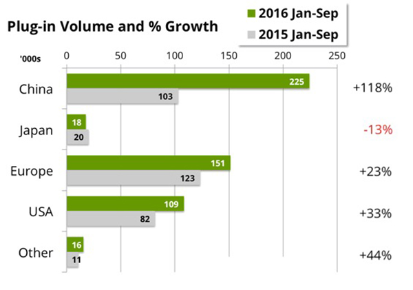 2016年(1~9月)世界主要區(qū)域市場電動汽車增長情況圖