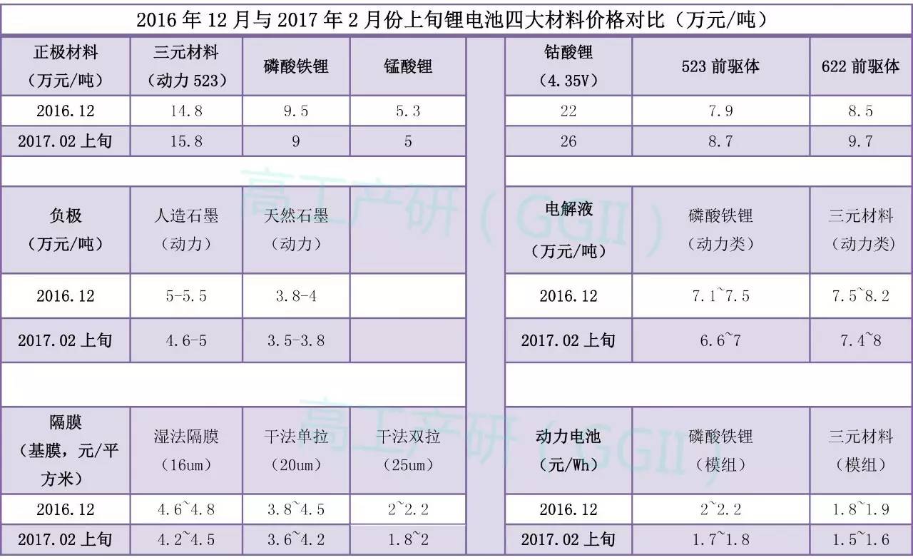 負(fù)極、電解液、隔膜三大材料中,2017年初均受到動(dòng)力電池價(jià)格下滑影響,各自產(chǎn)品價(jià)格均有較小幅度下滑。人造石墨同比去年年底下滑0.4~0.5萬/噸,天然石墨下降0.3~0.5萬/噸;濕法隔膜同比去年年底下降0.2~0.4元/平米,干法總體平均下滑0.2~0.5元/平米。