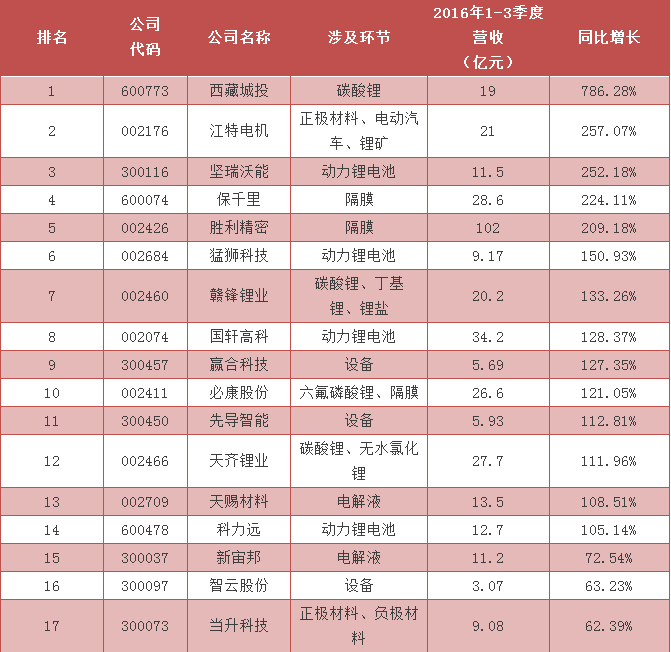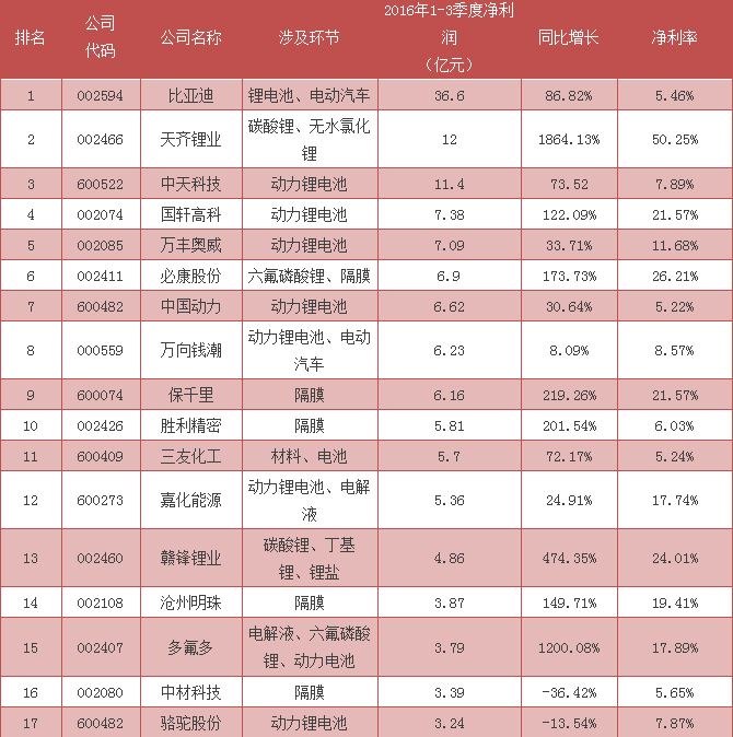 2016年最賺錢的鋰電上市公司排行榜