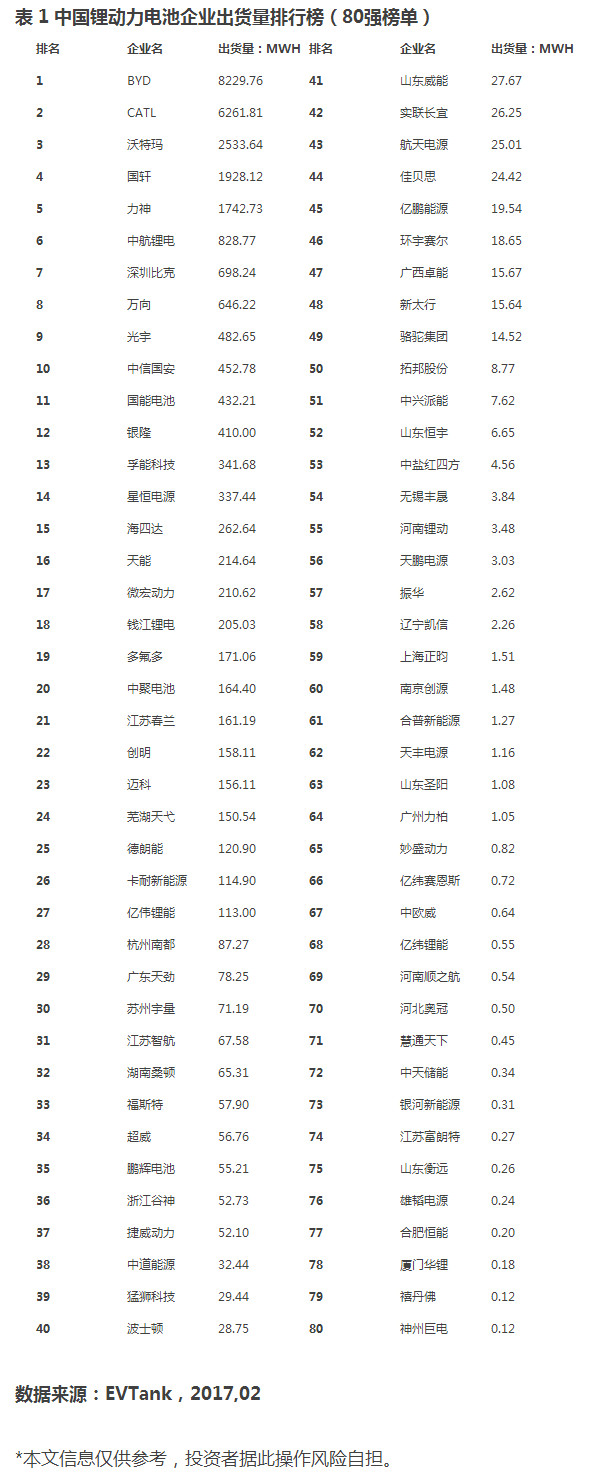 在EVTank發(fā)布的研究報(bào)告中,以附件的形式給出了中國主要動力電池企業(yè)排行榜,其排行榜依據(jù)為企業(yè)鋰動力電池出貨量。