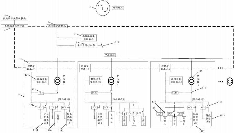 10.根據(jù)權(quán)利要求9所述的微電網(wǎng)系統(tǒng),其特征在于,所述區(qū)塊還包括網(wǎng)絡(luò)管理單元,所述網(wǎng)絡(luò)管理單元通過(guò)用戶端通訊總線與所在區(qū)塊的數(shù)據(jù)采集監(jiān)測(cè)單元、第二負(fù)荷控制器、 各微電源控制器和各第一負(fù)荷控制器相連; 所述微電網(wǎng)系統(tǒng)還包括: