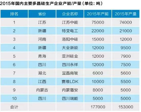 在多晶硅方面,2015年全國(guó)產(chǎn)量排名前十的企業(yè)產(chǎn)能總計(jì)達(dá)到17.7萬噸,產(chǎn)量約為15.3萬噸,分別占全國(guó)總產(chǎn)能、產(chǎn)量的93.2%、92.7%。