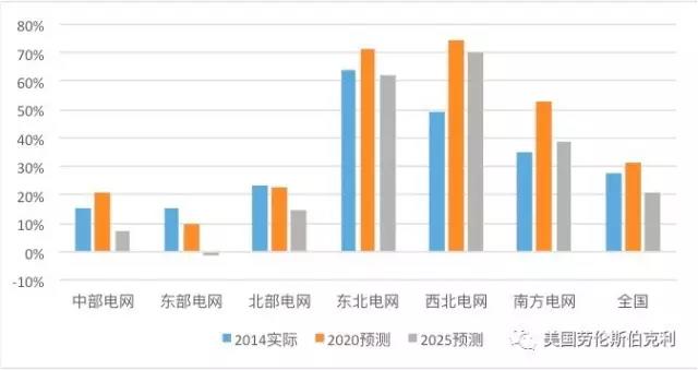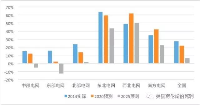 在高增長情境下,到2020年全國備用容量將下降到22%。從2020年到2025年,西北、東北和南部區(qū)域仍存在大量過剩產(chǎn)能。而東部、中部和北部區(qū)域則將需要從其他區(qū)域額外輸入電力,或新增本地發(fā)電能力。