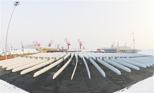 2月1日,一批國產風電葉片在江蘇連云港港口碼頭集結等待裝船出口。
