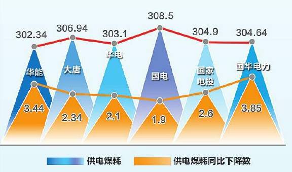 在本次對比的6家企業(yè)中,國華電力供電煤耗降幅最明顯,同比降低3.85克/千瓦時,全年供電煤耗完成304.64克/千瓦時。