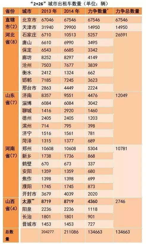 為此,小編查閱了《中國城市統(tǒng)計年鑒》,整理了征求意見稿中提及的2+26個城市出租車的數(shù)量,以及按照力爭的要求,換算出北京市全部更換、其他城市更換一半將產(chǎn)生的電動車需求量,見下表。