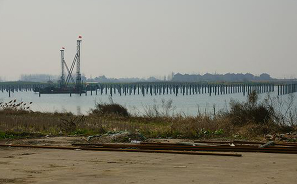 為“漁光互補(bǔ)”光伏發(fā)電項(xiàng)目打在湖里的柱樁。 志愿者卡卡 圖