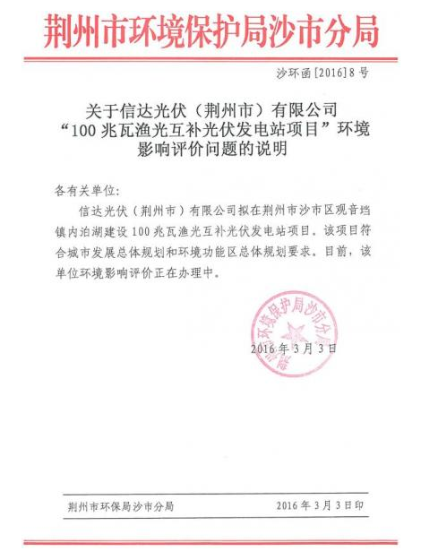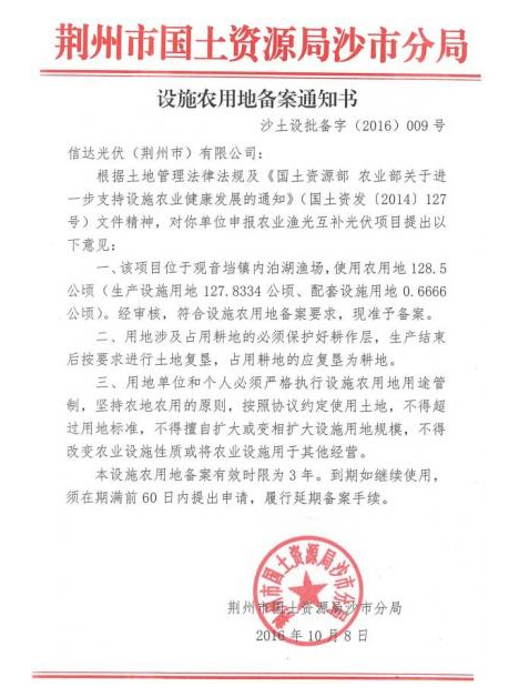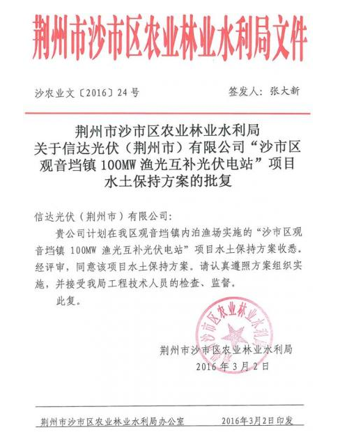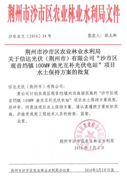 信達(dá)光伏還在郵件中寫道,荊州市沙市區(qū)農(nóng)業(yè)林業(yè)水利局批復(fù)了該項(xiàng)目的水土保持方案,荊州市國(guó)土資源局沙市分局批復(fù)了該項(xiàng)目設(shè)施農(nóng)用地備案要求。