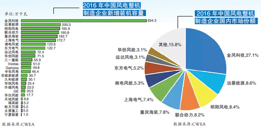 與此同時,截至2016年底,有五家整機制造企業(yè)的累計裝機容量超過1000萬千瓦,五家市場份額合計達(dá)到55.9%;其中金風(fēng)科技累計裝機容量達(dá)到3748萬千瓦,占國內(nèi)市場的22.2%。