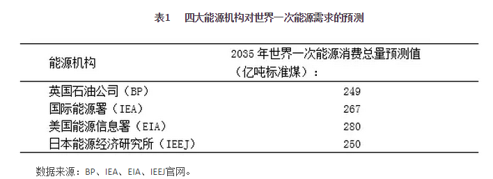 盡管當(dāng)前能源需求呈現(xiàn)疲軟態(tài)勢,但是亞洲、南美洲和非洲等新興市場國家經(jīng)濟(jì)仍有較大發(fā)展空間,工業(yè)化、城鎮(zhèn)化進(jìn)程將不斷推進(jìn),人口規(guī)模持續(xù)擴(kuò)大,未來將成為全球能源需求增長的主要驅(qū)動力。從BP、IEA等權(quán)威能源機(jī)構(gòu)的預(yù)測來看,盡管因?yàn)榻y(tǒng)計(jì)口徑及電力折一次能源方法不同導(dǎo)致對能源消費(fèi)總量的判斷存在差異,但趨勢大體相同。到2035年,世界一次能源消費(fèi)總量預(yù)計(jì)在249-280億噸標(biāo)準(zhǔn)煤的范圍內(nèi)波動(見表1)。其中,BP的預(yù)測最為保守,2035年世界一次能源消費(fèi)總量將達(dá)到249億噸標(biāo)準(zhǔn)煤,較2015年增加約61億噸標(biāo)準(zhǔn)煤,累計(jì)增長34%,年均增長1.4%,增速與近幾年相比較有小幅的提升。