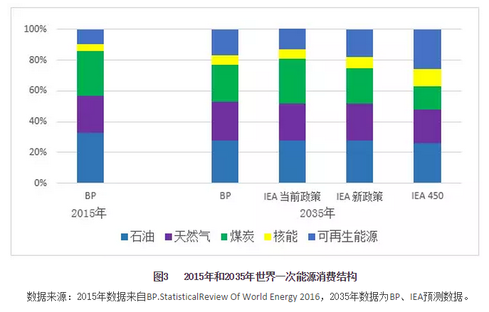 盡管短期內(nèi)化石能源作為主導(dǎo)能源的地位不會改變,但是受全球氣候變化、新技術(shù)的發(fā)展等因素的影響,未來能源結(jié)構(gòu)將會發(fā)生顯著變化。一方面,隨著2015年12月巴黎氣候大會的召開,迎來了人類應(yīng)對氣候變化的轉(zhuǎn)折點(diǎn)。《巴黎協(xié)定》提出控制全球平均氣溫升幅在2℃之內(nèi),到2030年全球碳排放量控制在400億噸,2080年左右實(shí)現(xiàn)凈零排放,并努力將氣溫升幅限制在1.5℃之內(nèi),2060年左右實(shí)現(xiàn)凈零排放。要達(dá)到上述目標(biāo),到本世紀(jì)下半葉,全球要逐漸結(jié)束化石能源時(shí)代,建立起以新能源和可再生能源為主體的低碳甚至零碳能源體系。為此各國都在不斷加大節(jié)能減排和推動可再生能源發(fā)展的力度,在可預(yù)見的未來,化石能源所占比重將不斷下降,同時(shí)可再生能源的比重不斷上升。另一方面,由于新技術(shù)的發(fā)展,天然氣的開采成本越來越低,且作為一種相對清潔、低碳的燃料,天然氣將取代煤炭成為第二大燃料。據(jù)BP預(yù)測數(shù)據(jù),到2035年,石油、煤炭在一次能源消費(fèi)中的占比分別約為28%、24%,與2015年相比,都下降了近5個(gè)百分點(diǎn);天然氣的比重與2015年相比提升了1個(gè)百分點(diǎn),約為25%;核能在一次能源消費(fèi)中的占比仍然較低,但也提升了1.5個(gè)百分點(diǎn)左右;可再生能源的比重變化最大,在未來的20年里上升了近7.5個(gè)百分點(diǎn)。